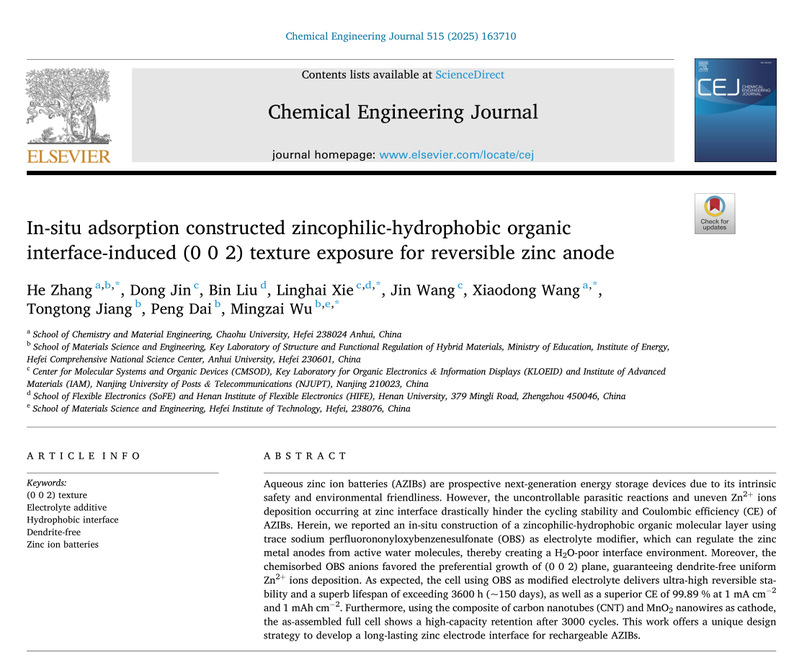 近日,我院張賀博士以第一作者,巢湖學院為第一通訊單位,在材料領域國際頂刊《Chemical Engineering Journal》(中國科學院1區TOP期刊,IF:13.2)上發表關于水系鋅離子電池電極界面精準調控方面的最新研究成果“In-situ adsorption constructed zincophilic-hydrophobic organic interface-induced (002) texture exposure for reversible zinc anode”。