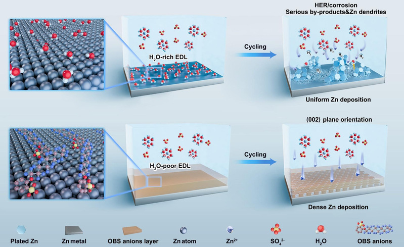 近年來,隨著電化學技術的發展,水系鋅離子電池已成為新一代儲能器件。為獲得可逆長循環壽命的電池性能和高利用率的金屬電極,構筑穩定的鋅電極界面是關鍵。張賀博士利用電解液工程策略,借助添加劑陰離子通過超分子弱作用力均勻吸附在電極界面處,形成致密的疏水屏蔽分子層,有效抑制析氫反應和界面腐蝕作用。此外,該分子層誘導Zn2+沿Zn(002)均勻致密沉積,消除枝晶,獲得穩定的鋅金屬電極。最終,研究發現在1 mA cm-2電流密度下實現了超過3600小時的超長循環壽命。該工作為鋅離子電池電極界面的設計與調控提供了新的研究思路,有助于推進鋅基電池的商業化應用。