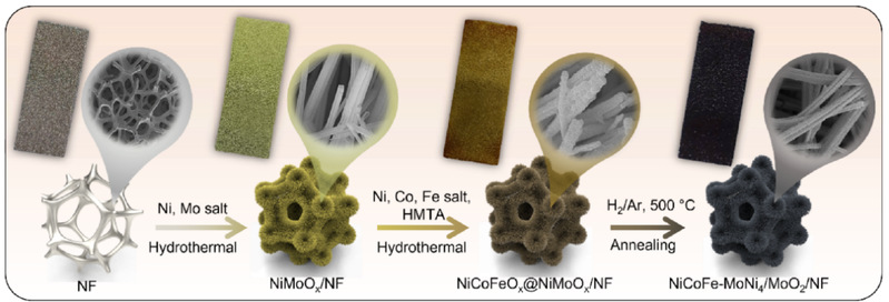 發展可再生能源和清潔能源技術需要設計高效的雙功能催化劑,以促進電化學水分解,而不依賴惰性金屬。本研究提出了一種新的三步策略,用于在泡沫鎳(NF)襯底上制備鎳鈷鐵(NiCoFe)改性鎳鉬合金/二氧化鉬(MoNi4/MoO2)納米線,標記為NiCoFe-MoNi4/MoO2/NF。合成的催化劑表現出優異的性能,在10 mA?cm-2電流密度下,析氫反應(HER)的過電位極低(13 mV),在50 mA?cm-2電流密度下,析氧反應(OER)的過電位為230 mV