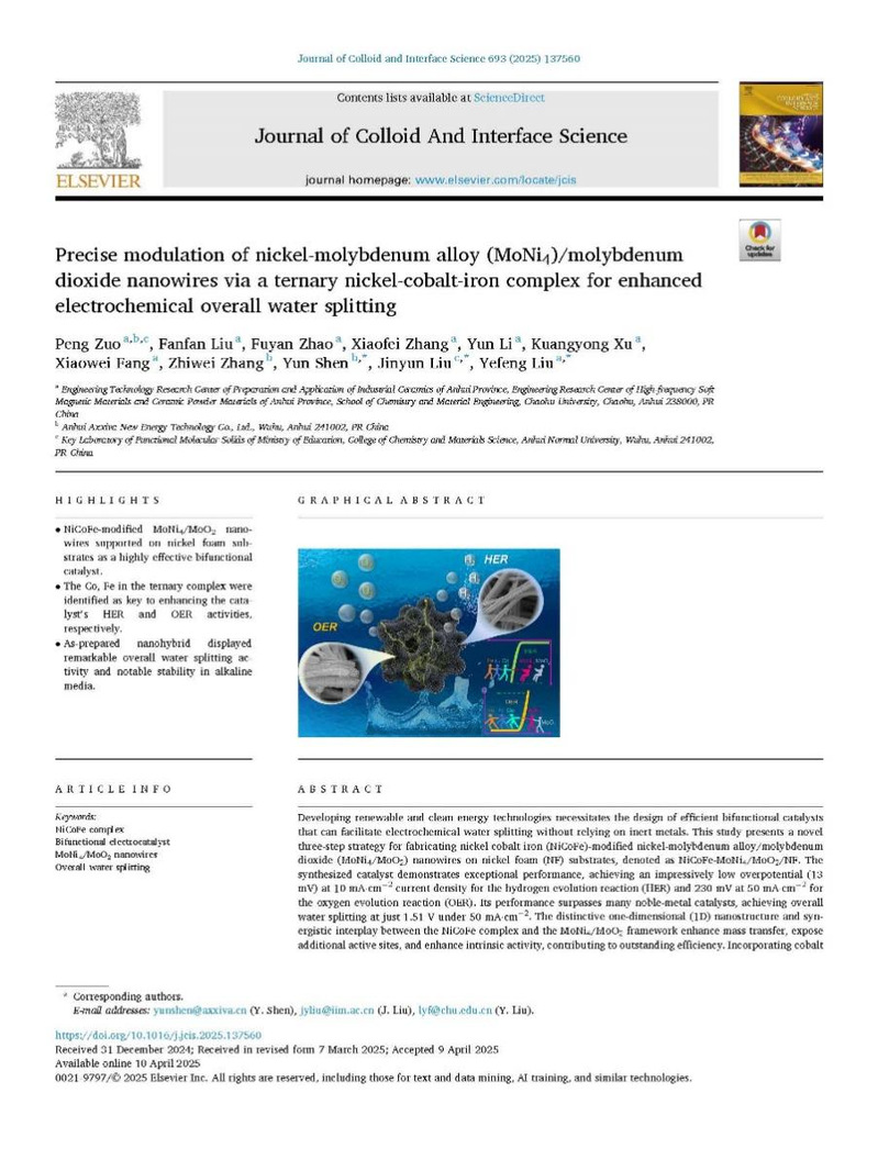 近日,我院新能源材料與器件科研創新團隊左鵬博士在開發高性能雙功能電解水催化劑研究中取得進展,相關成果以“Precise modulation of nickel-molybdenum alloy (MoNi4)/molybdenum dioxide nanowires via a ternary nickel-cobalt-iron complex for enhanced electrochemical overall water splitting”為題發表在國際權威期刊《Journal of Colloid and Interface Science》(中國科學院1區,IF9.7)。