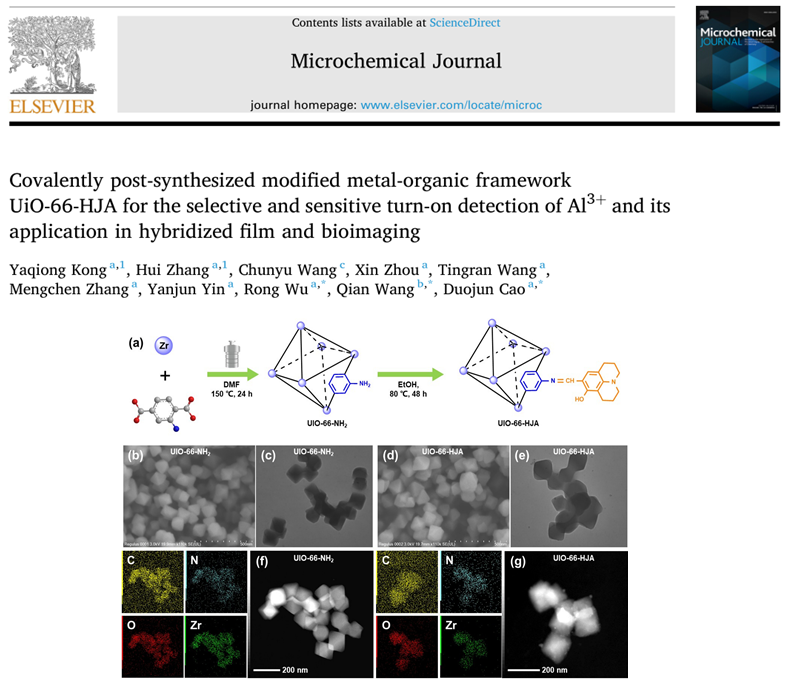 該工作利用希夫堿反應,通過共價后合成修飾(CPSM)策略構建出新型金屬有機框架(MOF)熒光傳感器—UIO-66-HJA。該材料對Al3+識別具有靈敏度高、選擇性好、生物成像優異等特點。此外,研究者進一步將UIO-66-HJA與PVA復合,制備出柔性、可折疊的熒光薄膜,實現了對實際水樣中Al3+的現場、可視化檢測。這項研究展示了MOF后修飾策略在構建高性能傳感平臺方面的強大能力,為開發用于環境和生物醫學檢測的多功能器件提供了新思路。研究成果發表在“Microchemical Journal, 2025, 216, 114569”。文章第一作者為我??讈啳偛┦?,我校本科生張慧同學為共同第一作者。通訊作者為我校曹多軍與吳蓉老師,以及吉林大學中日聯合醫院王茜博士。