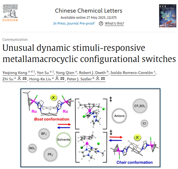 該工作設計合成了系列金屬大環化合物,通過單晶衍射,研究人員觀察到該大環具有多種不同的構象異構體,包括椅式、船式和扭船式。這些構型在溶液中能夠緩慢轉變,而陰離子種類對這一轉變過程起關鍵調控作用。該工作首次揭示了此類金屬大環的動態構型變化機制,為藥物載體、開發智能分子器件和新型催化劑提供了新思路。研究成果發表在“Chinese Chemical Letters, 2025, 111375,https://doi.org/10.1016/j.cclet.2025.111375”。文章第一作者為我校孔亞瓊博士,南京師范大學蘇巖博士為共同第一作者,通訊作者為南京師范大學的劉紅科教授與蘇志教授,以及英國皇家學會院士、華威大學Peter J. Sadler教授。
