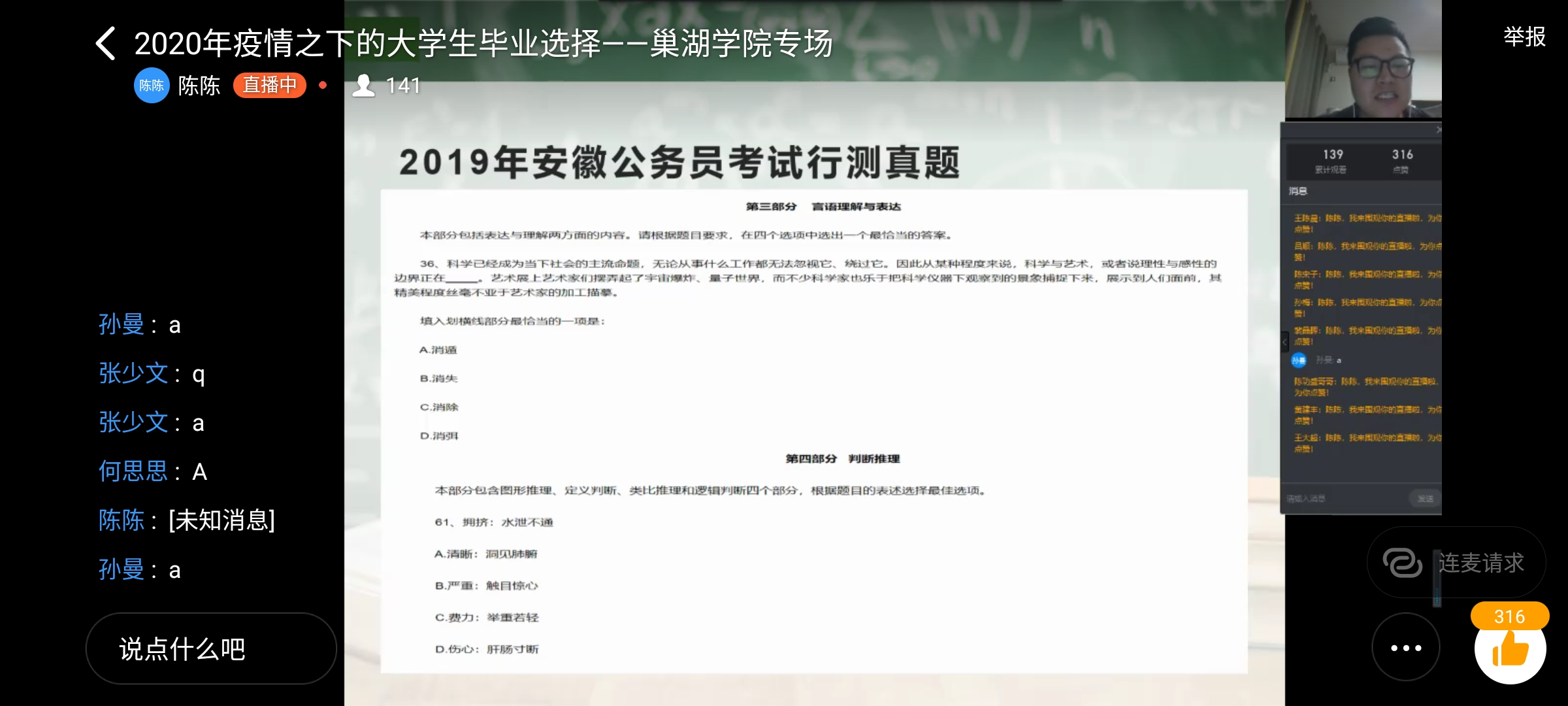 為進一步做好疫情形勢下2020屆畢業生就業工作,幫助同學們加強對當前就業形勢的認識,幫助畢業生實現更高質量和更充分就業,4月下旬,“2020年疫情之下的大學畢業選擇”主題宣講,通過釘釘線上直播平臺方式向同學們進行講解,華圖教育陳陳老師主要就考公、考研、就業政策等方面進行展開講解,為研究生復試、考公的同學提供實質性的幫助。