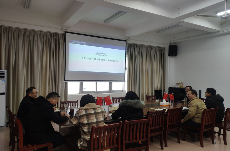 在民法典即將施行之際,法學教研室民商經濟法科研小組于12月9日下午三點,在經濟與法學學院三樓會議室開展相關科研活動。汪開明博士以《民法典—婚姻家庭編的制度創新》為題,為大家開展主題講座。法學教研室全體教師參加,學院副院長施瑋教授出席本次活動。