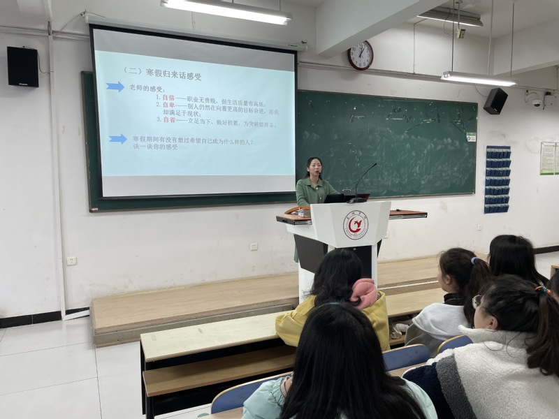 李陳首先結(jié)合ppt向同學(xué)們展示了“六個一”云打卡大學(xué)生寒假成長計劃中部分同學(xué)的優(yōu)秀作品,肯定了他們的態(tài)度和完成質(zhì)量,同時也從審題不清、抄襲現(xiàn)象嚴(yán)重、規(guī)范意識差等方面指出了完成情況中存在不足之處,并就其中的“制定學(xué)業(yè)規(guī)劃”活動警示大家,當(dāng)代大學(xué)生應(yīng)培養(yǎng)良好的生活和學(xué)習(xí)習(xí)慣,積極樹立人生目標(biāo),制定未來規(guī)劃,拒絕渾渾噩噩,浪費光陰。她結(jié)合自身經(jīng)歷和感受告誡同學(xué)們應(yīng)立足當(dāng)下、做好積累、為突破做準(zhǔn)備,而不是在別人為向更高的目標(biāo)奮進時自己卻滿于現(xiàn)狀。陳靜蕊同學(xué)主動分享的自身經(jīng)歷也讓同學(xué)們深刻感悟到堅定理想信念并未之不懈奮斗的重要性。