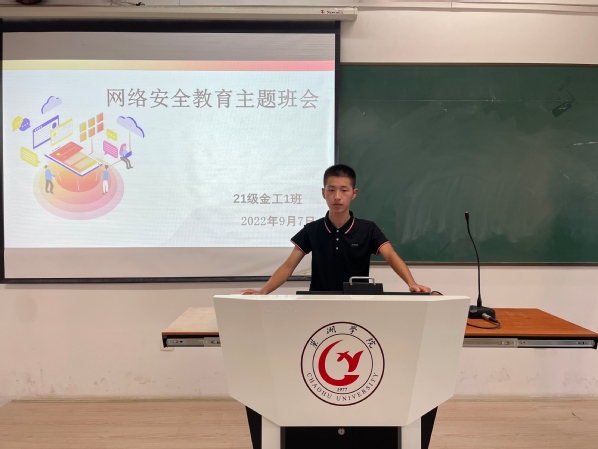 為進(jìn)一步加強(qiáng)校園網(wǎng)絡(luò)安全宣傳教育,提升同學(xué)們網(wǎng)絡(luò)安全意識和防范技能,營造安全、健康、文明、和諧的網(wǎng)絡(luò)文化氛圍,經(jīng)濟(jì)與法學(xué)學(xué)院21級金融工程一班于9月7日下午在慎思樓北301教室召開“網(wǎng)絡(luò)安全”主題班會。本次會議由網(wǎng)絡(luò)委員劉天賜主持,21級金融工程一班全體成員參與。