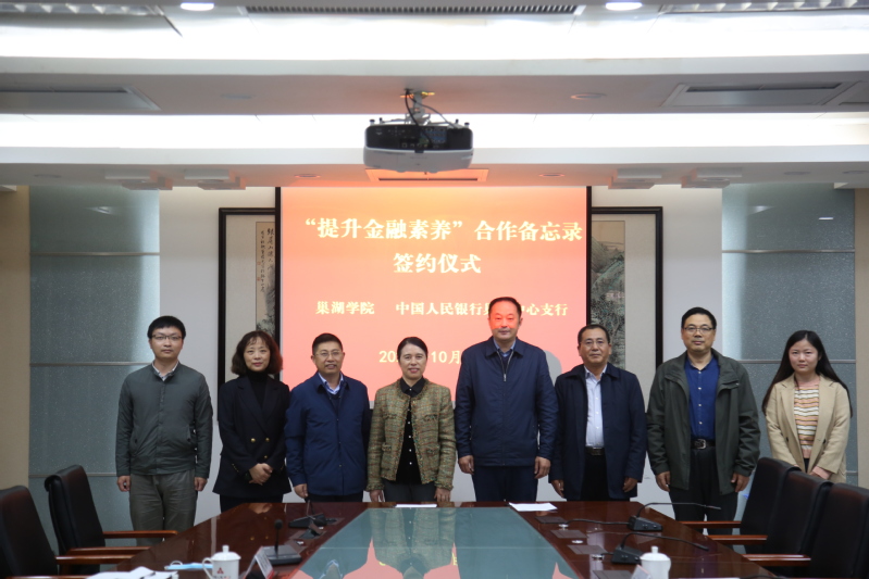 為加強(qiáng)社會(huì)實(shí)踐平臺(tái)建設(shè),鞏固畢業(yè)生就業(yè)實(shí)習(xí)渠道,提升高校學(xué)生金融素養(yǎng),深入推進(jìn)銀校合作,10月27日下午,校黨委委員、副院長(zhǎng)朱定秀,經(jīng)濟(jì)與法學(xué)學(xué)院院長(zhǎng)徐志倉(cāng)、黨委副書記解雪梅等一行赴中國(guó)人民銀行巢湖中心支行簽署合作備忘錄。中國(guó)人民銀行巢湖中心支行黨委副書記、副行長(zhǎng)朱波,黨委委員、副行長(zhǎng)凌代才、辦公室主任王祥君出席了簽約儀式。