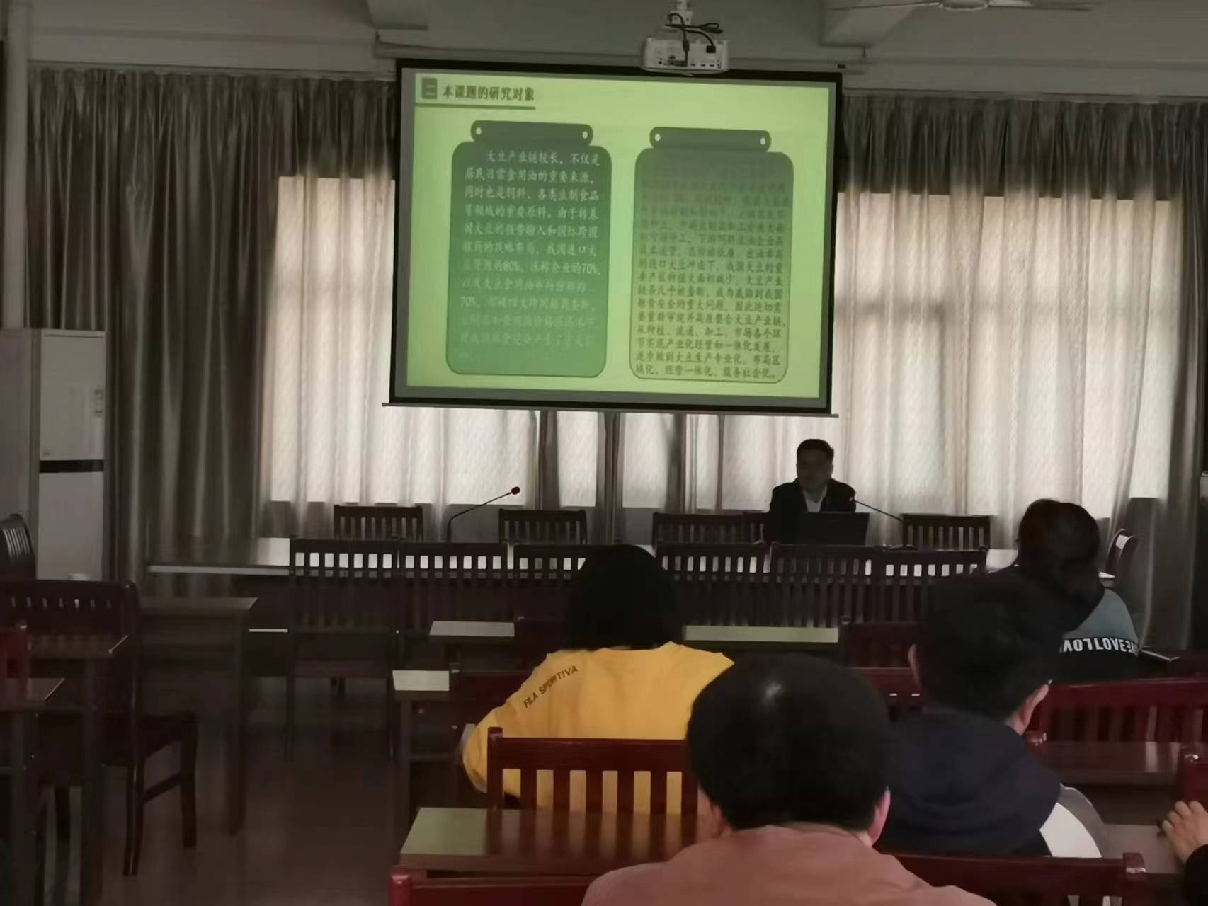 為了促進教師從事科研工作積極性、提升教職工科研水平和打造高質(zhì)量科研團隊既定目標,同時考慮到新進博士深度融入我院科研團隊的現(xiàn)實訴求,本學期我院繼續(xù)展開科研匯報講座活動。3月15日下午,在求實樓三樓會議室展開本年度科研匯報第一講。本期主講人是楊軍博士,他分享的主題是“我國大豆產(chǎn)業(yè)鏈安全保障問題研究”。