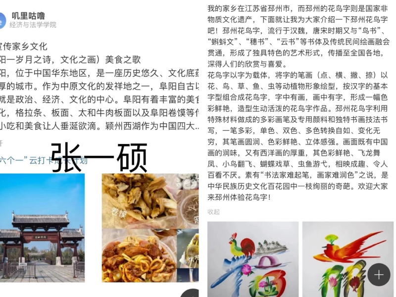 宣傳家鄉文化,潤物無聲,鄉情如夢。家鄉承載著我們的成長軌跡,見證著我們的點點滴滴,是深刻人文內涵的生動載體。寒假期間,學子們紛紛用圖片、視頻展現了家鄉的美景,用文字描繪了家鄉的人文歷史和風土人情,用實際行動做家鄉文化的線上傳播者和宣傳員。