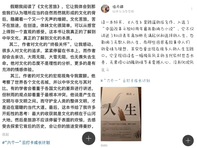 閱讀經典書目,寧靜致遠,書香修身。書籍是人類智慧的結晶,更是人類進步的階梯。同學們通過“閱讀一本好書”的閱讀打卡方式,從歷史中找答案,從現實中找參照,用心感悟經典的魅力,享受閱讀的價值與樂趣。