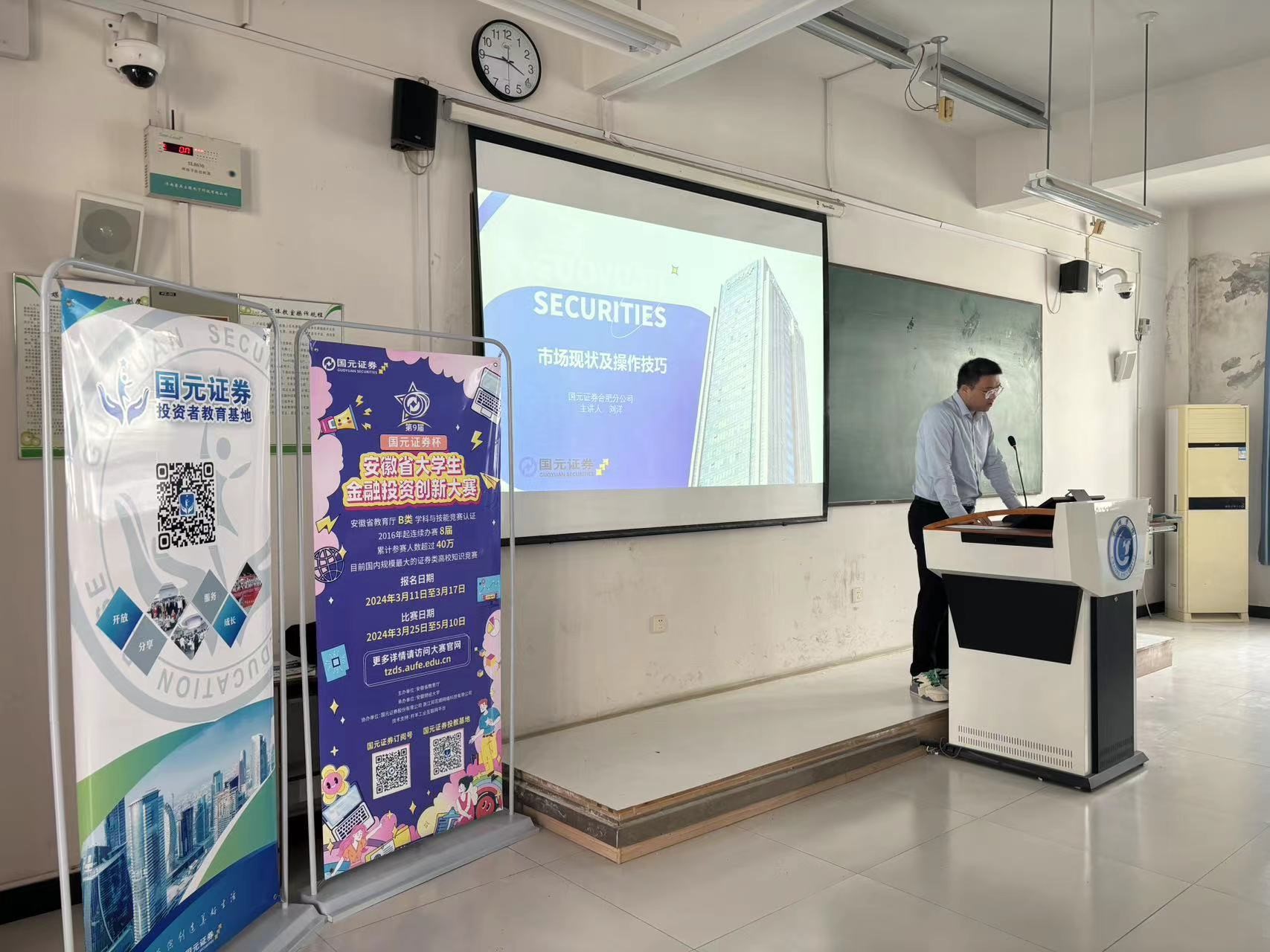 2024年4月24日下午,經法學院邀請到國元證券合肥分公司投資顧問劉洋為參加2024年安徽省大學生金融投資創新大賽的同學們舉行了一場精彩的講座,旨在幫助參賽者提升金融投資素養和實戰能力,能在比賽中取得更優異的成績。2022級金融工程專業學生聆聽了本次講座。講座的主題是市場現狀及操作技巧。