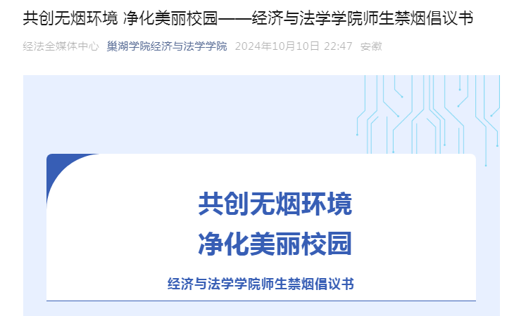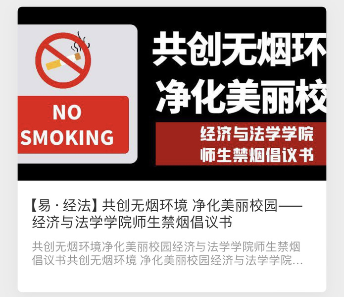 一支香煙,看似微不足道,卻能侵蝕健康,引發(fā)多種疾病,無論是對吸煙者自身,還是身邊人,都可造成不可逆的危害。為擴大宣傳范圍,強化宣傳效果,學(xué)院充分利用易班工作站,在“兩微一端”等新媒體傳播平臺,發(fā)布題為:【共創(chuàng)無煙環(huán)境 凈化美麗校園 經(jīng)濟與法學(xué)學(xué)院師生禁煙倡議書】的推文。倡議書呼吁老師們以身作則,為學(xué)生樹立良好的榜樣,展現(xiàn)健康生活的良好風貌;鼓勵學(xué)生們愛惜身體,遠離香煙誘惑,以蓬勃的朝氣投入到學(xué)習與生活中。禁煙倡議書,引起廣泛的關(guān)注和積極的響應(yīng),提高師生們對吸煙危害的重視,增強師生禁煙的自覺性,引導(dǎo)全體師生做“無煙校園”的引領(lǐng)者、踐行者、宣傳者和監(jiān)督者。