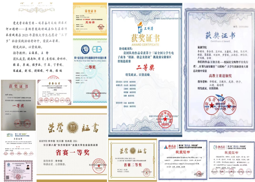 通過完善的質量保障體系和有效的教學過程質量監管機制,學生培養質量得到顯著提升。近5年,學生獲省級以上各類學科競賽獎項460余項,其中包括全國管理決策模擬大賽特等獎(第一名)、全國金融與證券投資模擬實訓大賽一等獎、“天欣杯”中國裁判文書寫作大賽全國二等獎、安徽省大學生商務談判大賽特等獎、安徽省大學生國際貿易綜合技能大賽一等獎、安徽省金融投資創新大賽一等獎、安徽省模擬法庭大賽季軍等。學生獲批國家級大創項目16項,發表學術論文26篇。