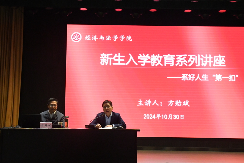 為引導(dǎo)新生堅(jiān)定理想信念,明晰未來前進(jìn)方向,系好人生“第一扣”,10月30日下午,經(jīng)濟(jì)與法學(xué)學(xué)院于大學(xué)生活動(dòng)中心4樓多功能廳舉辦2024級(jí)新生入學(xué)教育報(bào)告會(huì)。本次報(bào)告會(huì)由安慶市煙草專賣局黨組書記、局長(zhǎng)方貽斌主講,經(jīng)法學(xué)院黨委書記石庭主持,2024級(jí)法學(xué)和國(guó)際經(jīng)濟(jì)與貿(mào)易專業(yè)全體同學(xué)參加了報(bào)告會(huì)。