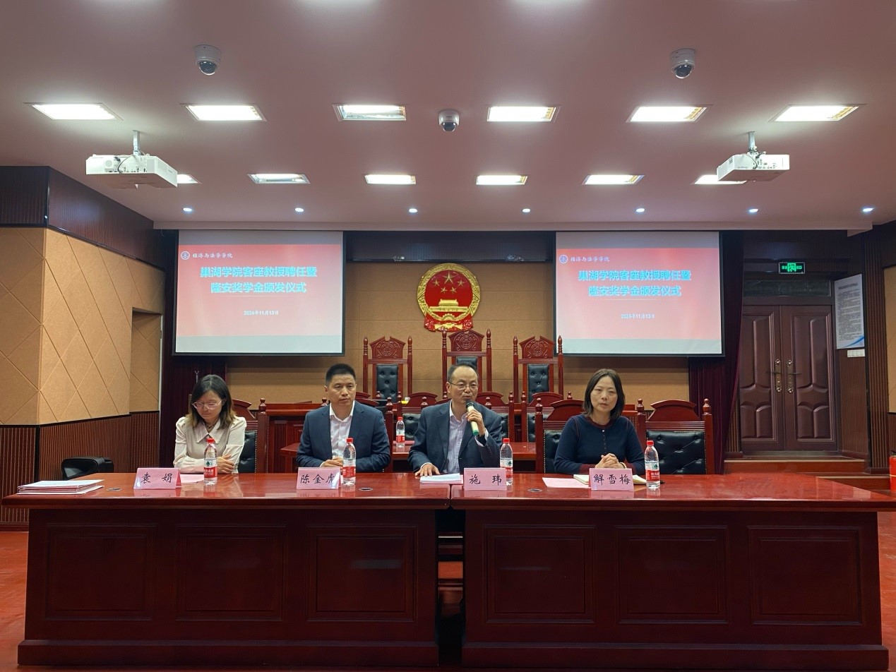 講座前舉行了客座教授聘任暨隆安獎學金頒發儀式,聘任北京隆安(合肥)律師事務所陳金虎律師、袁娟律師為經法學院客座教授,并為獲得本年度隆安獎學金的10位同學頒發了獲獎證書。