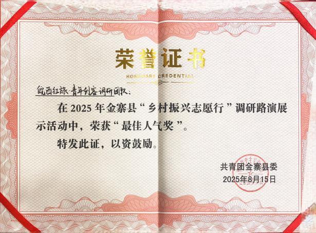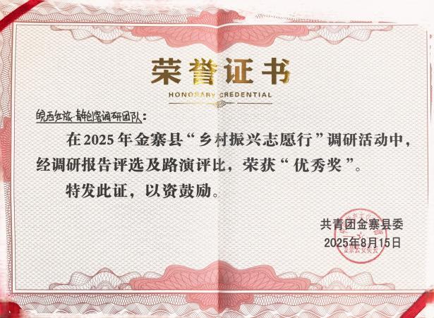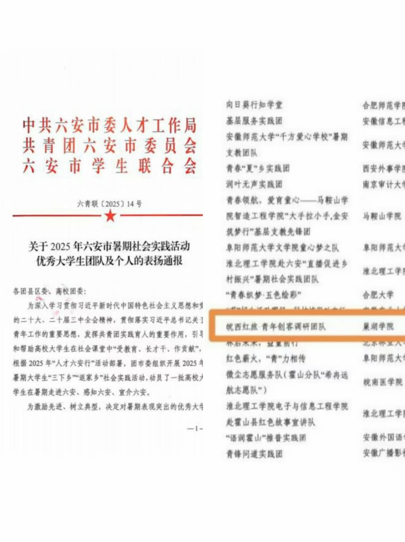 近日,2025年六安市“鄉(xiāng)約皋地 淬煉青春”大學(xué)生暑期社會實(shí)踐活動評選結(jié)果揭曉。巢湖學(xué)院經(jīng)濟(jì)與法學(xué)學(xué)院“皖西紅旅·青年創(chuàng)客調(diào)研團(tuán)隊(duì)”因在鄉(xiāng)村振興調(diào)研中表現(xiàn)突出,獲評“優(yōu)秀團(tuán)隊(duì)”榮譽(yù)稱號。這也是我校唯一一支獲評六安市“三下鄉(xiāng)”暑期社會實(shí)踐的優(yōu)秀團(tuán)隊(duì)。