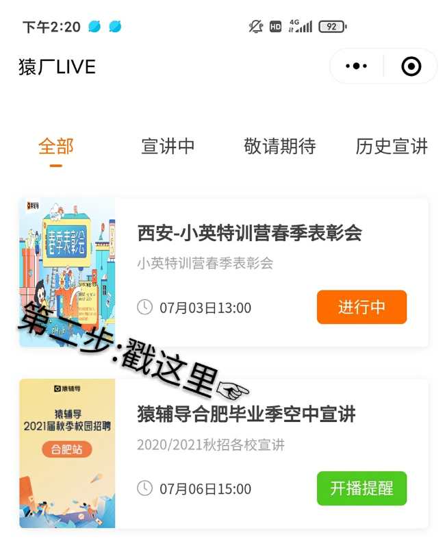 猿輔導合肥分公司安排7月6日(下周一)下午15:00,將在開展畢業(yè)季空中招聘宣講會,請同學們屆時觀看。觀看方式如下: