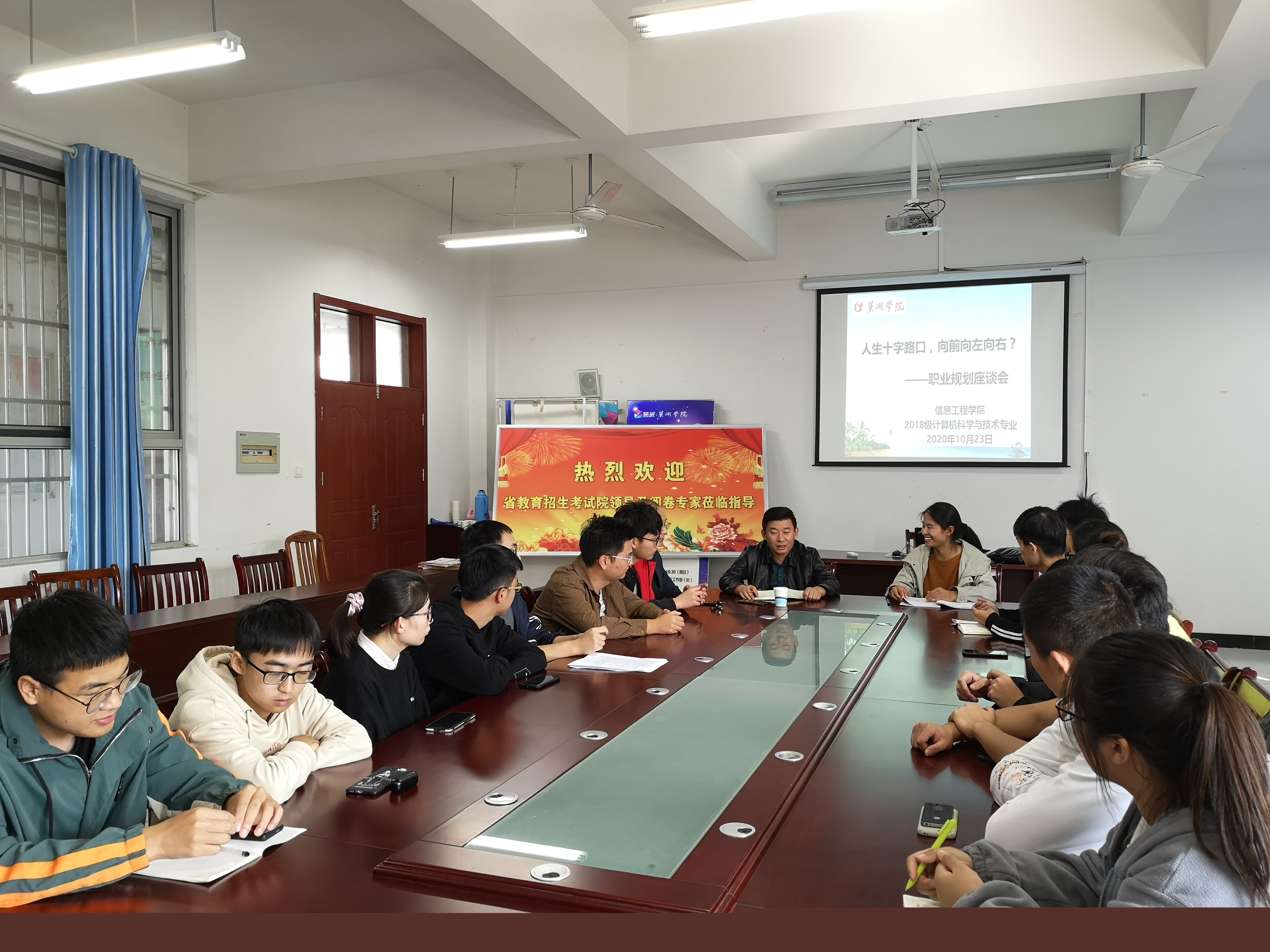 在宿舍的交談中,了解到班級同學在職業規劃方面有許多迷茫,針對同學們的困惑,10月23日14:30,在信息工程學院會議室召開主題為“人生十字路口,向前向左向右?”職業規劃座談會。座談會上,同學們暢所欲言,紛紛就目前在考研、考公、創業以及就業等方面存在的困惑向郭超老師提問:如考研目標專業和院校的確定,考公目標崗位和地區的確定;大學生創業前期準備;如何選擇就業單位等等。郭超結合自己體會對同學們的問題一一作出耐心詳細解答,希望他們“樹目標、強意志、補短板、成事業”。藍圖已繪,重在落實。以“不破樓蘭終不還”的強大意志力,不斷地補短板、堵漏洞、強弱項,必能將事情做專、做細、做精。