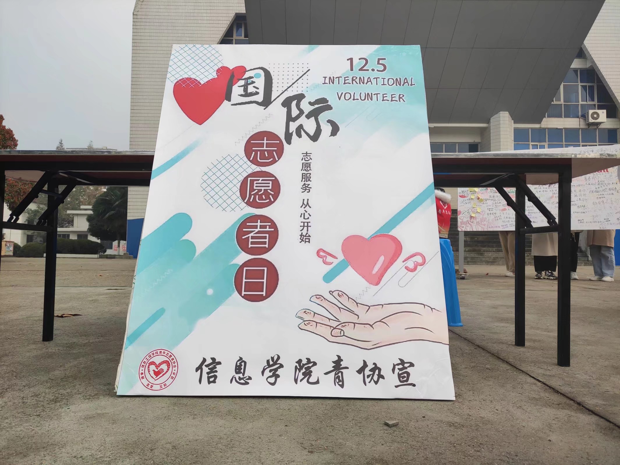 為弘揚志愿精神,展示我校青年志愿者行動的經驗和成果,促進我校志愿者服務工作的發展,信息工程學院青年志愿者協會于12月3日至12月5日在校一食堂前舉辦以“志在心中,愿在行動”為主題的國際志愿者系列活動。