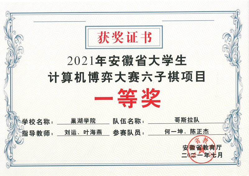 2021年安徽省大學生計算機博弈大賽“六子棋”一等獎