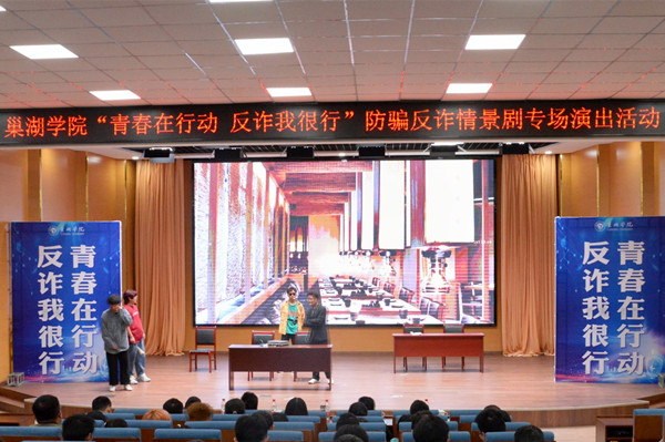 為進一步強化校園反詐宣傳教育、普及反詐知識,提高學生識騙防詐能力,營造校園反詐防騙的濃厚氛圍,4月26日下午,由保衛處、學生處、團委主辦,計算機與人工智能學院承辦,雷雨話劇社協辦的主題為“青春在行動反詐我很行”反詐防騙情景劇專場演出在求實樓報告廳開演。宣傳部、學生處、保衛處、團委、合肥市公安局巢湖經開區分局、半湯街道領導,各二級學院副書記及輔導員、學生代表共同觀看演出,演出活動同步進行線上直播。