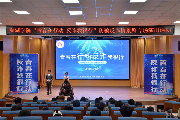 為進一步強化校園反詐宣傳教育、普及反詐知識,提高學生識騙防詐能力,營造校園反詐防騙的濃厚氛圍,4月26日下午,由保衛處、學生處、團委主辦,計算機與人工智能學院承辦,雷雨話劇社協辦的主題為“青春在行動反詐我很行”反詐防騙情景劇專場演出在求實樓報告廳開演。宣傳部、學生處、保衛處、團委、合肥市公安局巢湖經開區分局、半湯街道領導,各二級學院副書記及輔導員、學生代表共同觀看演出,演出活動同步進行線上直播。