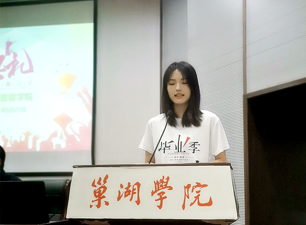 2019級軟件工程專業田姿同學代表全體畢業生發言,她回憶了四年來校園生活的點點滴滴,表達了對母校以及同學們不舍之情,她表示將秉持校訓,肩負時代責任,不負青春,做新時代奮勇前進的搏擊者。