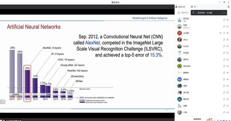 本次學術報告晚上7點30分在騰訊會議上準時開始,吳其林教授首先對王教授表示了熱烈的歡迎,并簡單介紹了王教授的學術經歷。之后,王教授開始正式的學術報告,王教授的報告深入淺出,他首先全面系統地介紹了人工智能的誕生及發展歷程,然后從系統體系的角度闡述了對人工智能的理解和思考,此外,王教授還結合當下流行的chatGPT等人工智能新興技術進一步提出了對人工智能發展方向的思考。會議內容充實飽滿,引人思考。王教授報告完后,吳其林教授對本次報告做了簡短總結。