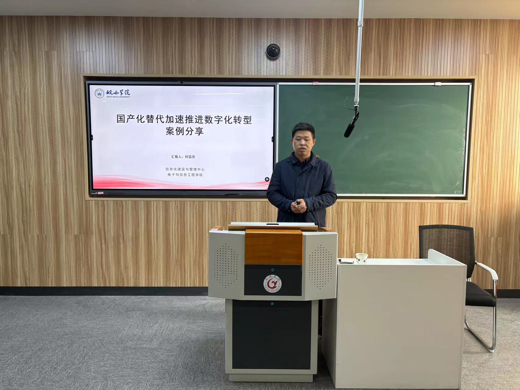 12月2日,應計算機與人工智能學院邀請,皖西學院何富貴博士來我院做了題為《國產化替代加速推進數字化轉型案例分型》的講座。會議由副院長程軍主持,信息化處處長陳立鋼出席會議,參會人員有巢湖學院骨干教師,以及感興趣的學生。