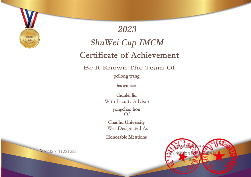近日,2023年第九屆數維杯國際大學生數學建模挑戰賽成績公布,巢湖學院計算機與人工智能學院參賽隊(隊員王佩龍、曹浩宇、劉春蕾)在侯勇超老師的帶領下獲得國際賽二等獎1項。