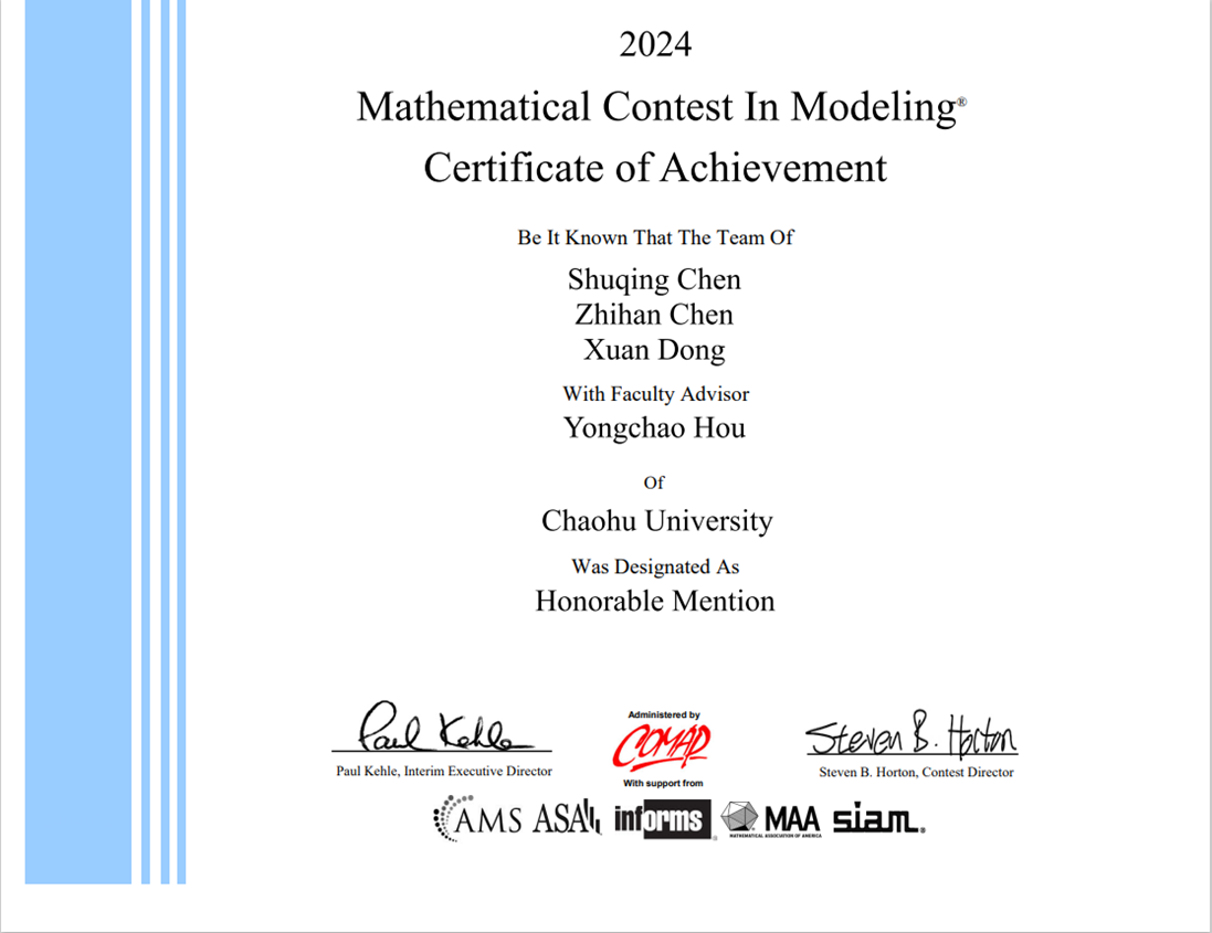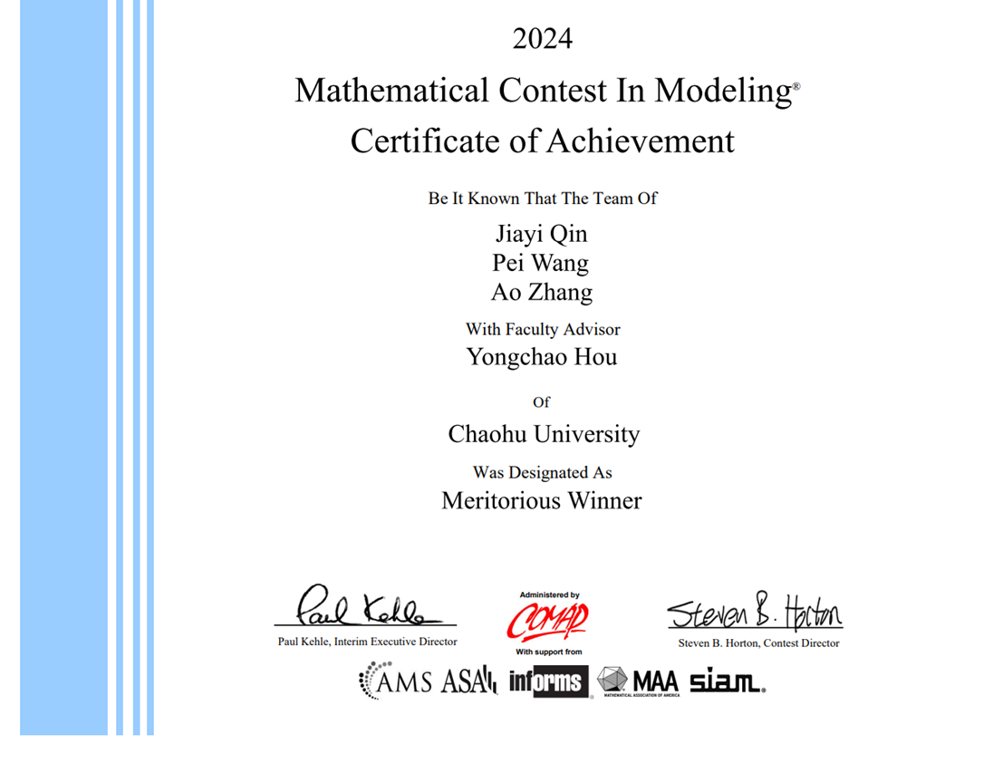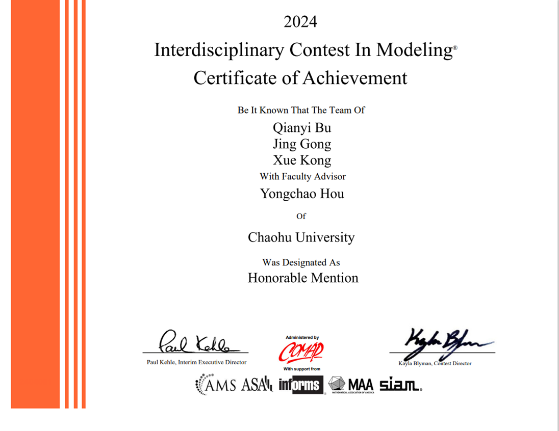 近日,2024年美國大學生數學建模競賽(Mathematical Contest in Modeling/ Interdisciplinary Contest in Modeling, MCM/ICM)成績正式揭曉。此次比賽巢湖學院共遴選出5支隊伍參加比賽,在全體參賽隊員與指導教師的奮力拼搏下,在獲獎等級和數量上均取得歷史性突破。其中,首次獲得國際一等獎(Meritorious Winner,獲獎率為6.66%)1項(秦家怡、王佩、張傲)、首次獲得國際二等獎(Honorable Mention,獲獎率為23.06%)2項(陳淑晴、陳芷晗、董璇;卜前億、孔雪、宮靜),使得我們在二等獎及以上獎項獲獎率達60%,遠超全球31.6%的獲獎率。