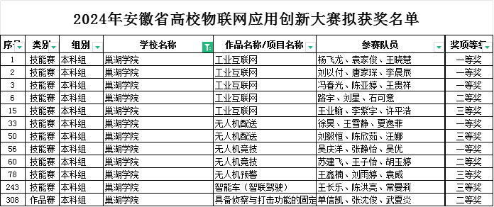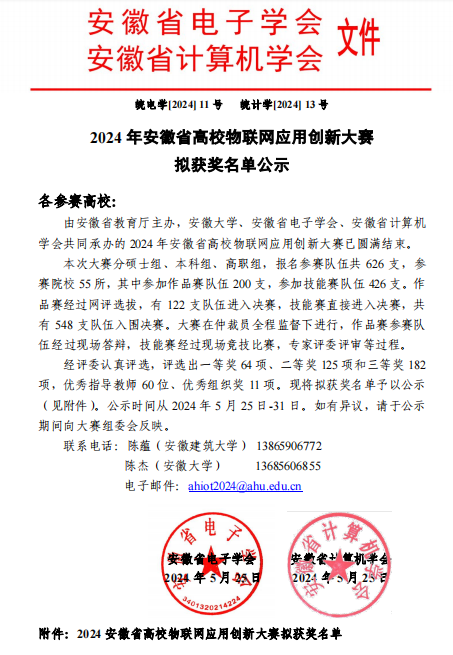 近日,由安徽省教育廳主辦,安徽大學、安徽省電子學會、安徽省計算機學會共同承辦的2024年安徽省高校物聯網應用創新大賽已圓滿結束,報名參賽隊伍共626支,參賽院校55所。巢湖學院代表隊在激烈的競爭中脫穎而出,憑借出色的技術創新和團隊協作能力獲得了優異成績,共獲得一等獎5項,二等獎3項,三等獎3項,其中參加工業物聯網賽道的5支代表隊全部獲獎,并且有3支代表隊包攬該賽道一等獎,巢湖學院榮獲“優秀組織單位”稱號。