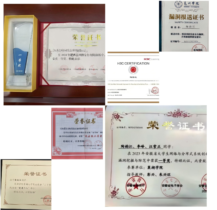 大二上學期,陶韻江與兩名同學在巢湖學院創業園創立“巢安網絡信息安全軟件有限責任公司”。創業初期,團隊自主研發自動化漏洞掃描工具,為中小型企業提供低成本安全檢測服務,累計提交高危漏洞80余份,連續兩年(2023-2024)獲評巢湖學院創業園優秀項目。2023年7月,公司首次承接省級網絡安全攻防演練項目。陶韻江-作為團隊隊長成功組建15人專業團隊,為5家省市企事業單位提供實時防護。同年9月,陶韻江作為團隊隊長帶領團隊獲得安徽省大學生網絡與分布式系統創新設計大賽網絡漏洞挖掘與防范一等獎。此后,他一直帶領團隊參與由各地網信辦,公安局舉辦的網絡安全攻防演練,并屢獲佳績。