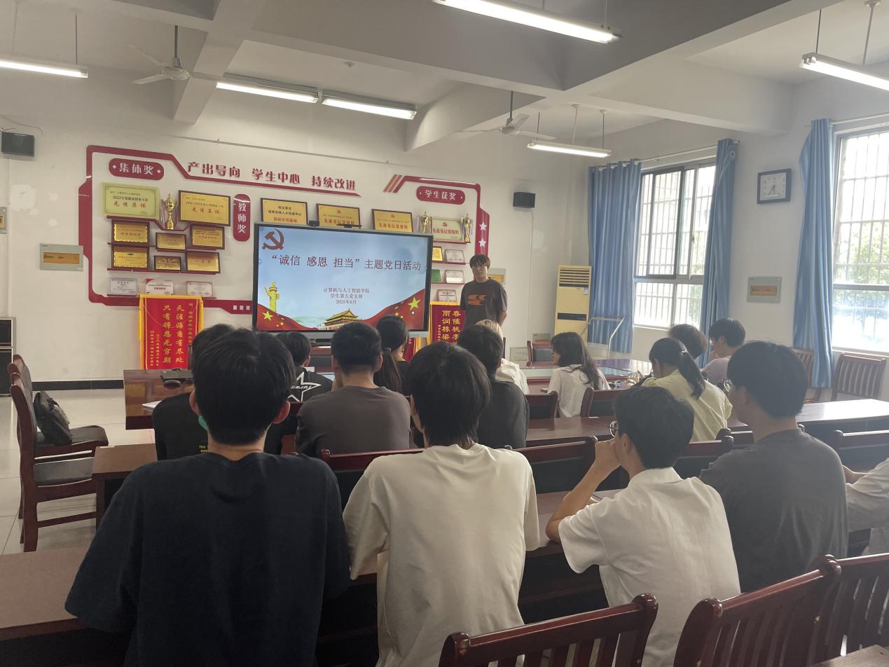 學院通過挖掘和宣傳身邊可信、可學的勵志典型,發揮先進榜樣的勵志示范引領作用。學生第五黨支部以“誠信 感恩 擔當”為主題開展黨日活動。在國際數學建模競賽中獲得一等獎的學生黨員王佩龍圍繞學業規劃、學科競賽等方面,分享大學三年的成長與感悟。他認為,誠信是學術競賽的基石,感恩是成長的階梯。三年來,每一次獲獎都源于對規則的堅守,更離不開師長的指導和學校的培養,未來將以所學投身科技報國,反哺社會。