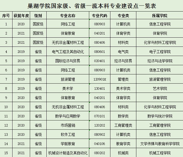 一流本科專業(yè)建設(shè)是教育部貫徹落實(shí)新時代全國高校本科教育工作會議精神、全面振興本科教育、提高高校人才培養(yǎng)質(zhì)量、實(shí)現(xiàn)高等教育內(nèi)涵式發(fā)展的重要舉措。巢湖學(xué)院始終堅持以人才培養(yǎng)為中心,全面落實(shí)“以本為本,四個回歸”,以一流本科專業(yè)建設(shè)“雙萬計劃”為引領(lǐng),通過專業(yè)認(rèn)證、專業(yè)評估、卓越人才培養(yǎng)計劃以及現(xiàn)代產(chǎn)業(yè)學(xué)院建設(shè)等,持續(xù)推進(jìn)專業(yè)內(nèi)涵建設(shè)和特色發(fā)展。為全力做好本次一流專業(yè)申報和建設(shè)工作,學(xué)校提前謀劃,精心布局,積極深入各學(xué)院調(diào)研,組織召開多場申報動員、交流指導(dǎo)和評審會,多次邀請專家論證打磨,極大地提高了申報的成功率,提升了專業(yè)建設(shè)的水平和能力。