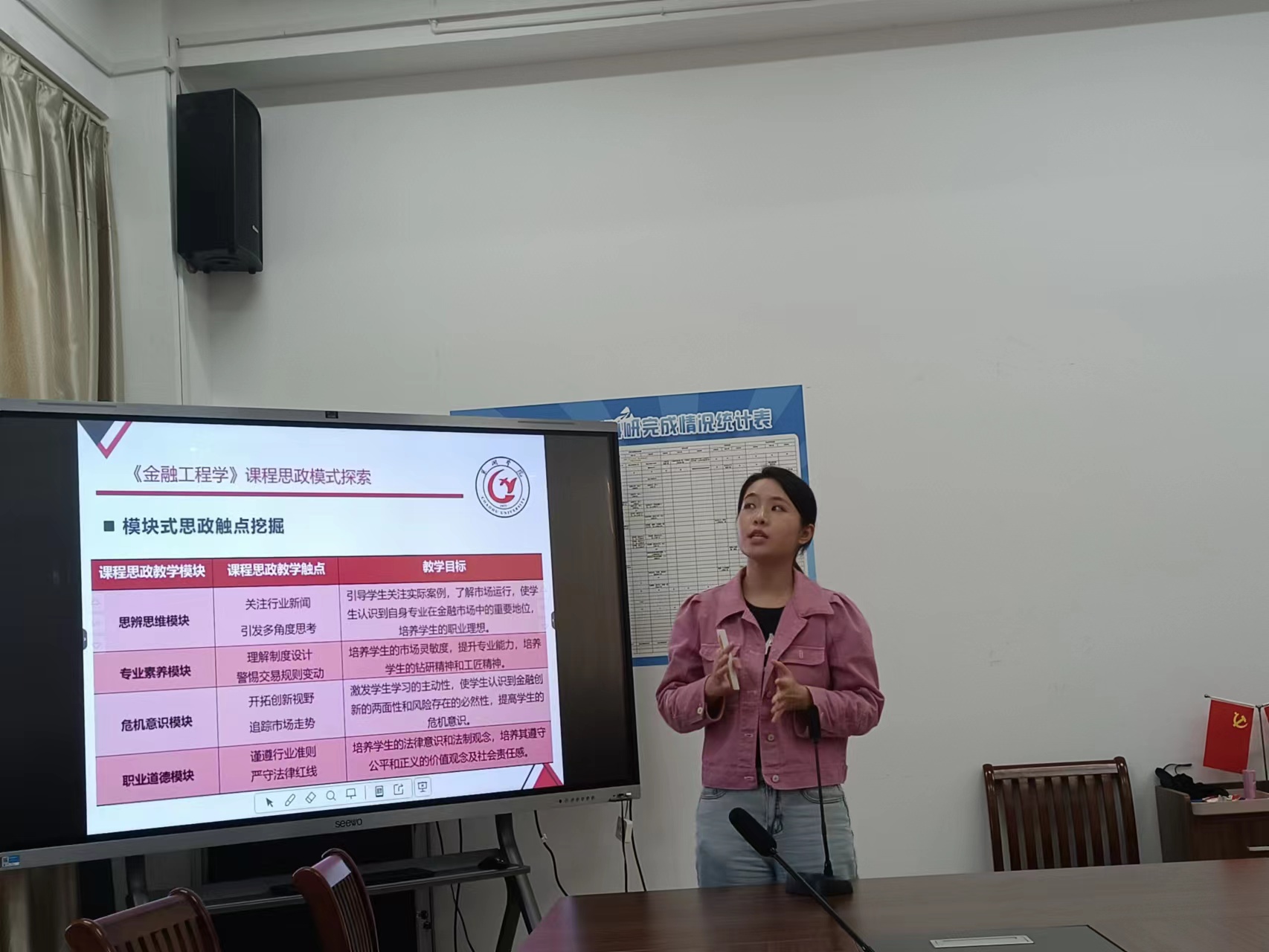 隨后,來自經(jīng)濟與法學(xué)學(xué)院的四名教師分別結(jié)合他們所授課程作了課程思政教學(xué)經(jīng)驗分享。其中,穆瀾老師針對《西方經(jīng)濟學(xué)》課程思政設(shè)計進行了交流,主要圍繞課程思政設(shè)計的原則、設(shè)計的重點與難點、設(shè)計的流程三個方面作了介紹;潘選明老師與大家分享了《國際服務(wù)貿(mào)易》課程思政的教學(xué)經(jīng)驗,重點從課程思政目標設(shè)置、思政元素挖掘、思政案例設(shè)計等方面作了介紹;周建廠老師從律師道德職業(yè)素養(yǎng)角度,結(jié)合具體案例對《法律職業(yè)倫理》課程內(nèi)容與思政元素融入作了介紹;唐蔚老師則作了題為“金融工程學(xué)——課程思政元素探討”匯報,她從模塊式思政觸點挖掘、啟發(fā)式思政教育引導(dǎo)、互動式思政路徑創(chuàng)設(shè)三個方面對金融工程學(xué)課程思政路徑進行了論析。