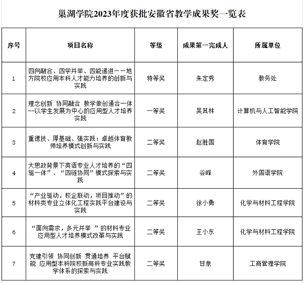 近日,安徽省教育廳公布了2023年度安徽省高校教學(xué)成果獎評選結(jié)果,我校斬獲7項(xiàng)教學(xué)成果獎,其中特等獎1項(xiàng)、一等獎1項(xiàng),二等獎5項(xiàng),取得歷史以來最好成績。其中學(xué)校教學(xué)督導(dǎo)組組長朱定秀教授主持的《四向融合、四學(xué)并舉、四能遞進(jìn)——地方院校應(yīng)用本科人才能力培養(yǎng)的創(chuàng)新與實(shí)踐》獲得特等獎。