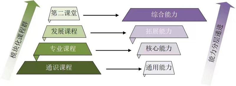 構建“四層能力”遞進培養體系。通過咨詢用人單位、走訪行業領域專家學者、調研歷屆校友和訪談社會人士等途徑,建立人才能力線性發展模型,按照能力分層遞進思路,制定人才培養方案指導意見,推行人才“基本、專業、發展、綜合”四層能力遞進培養。系統深入研究知識、課程與能力之間的關系,采用跨界、交叉、整合、優化等方式,通過研制特色培養方案、搭建優秀資源平臺、建構一流專業課程鏈網、打造高水平教科研團隊、加強激勵與考核評價等舉措,輔以“請進來”“走出去”和“高頻度”“多向度”融通機制,在要素集聚和流程優化中,實現學生能力培養由低到高、由粗到專、由窄到寬等多層面提升。