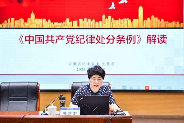 會上,關慧君從深刻認識《條例》修訂的重大意義、準確把握《條例》修訂的重點內容、抓好《條例》貫徹執行的意見建議三個方面,結合典型案例和豐富的工作經驗,對新修訂的《條例》作了詳細解讀。關慧君指出,開展黨紀學習教育,是促進全黨深刻領悟“兩個確立”的決定性意義、堅決做到“兩個維護”的必然要求;是貫徹落實習近平新時代中國特色社會主義思想的具體行動;是堅持問題導向,用嚴明的紀律管全黨治全黨的現實需要;是總結從嚴管黨治黨經驗、實現制度與時俱進的實踐要求。關慧君強調,一要深入學習領會,模范遵規守紀;二要落實重點舉措,凝聚強大合力;三要嚴格精準執紀,維護紀律權威。