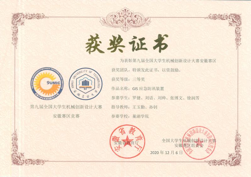 第九屆全國大學生機械創新設計大賽(安徽賽區)三等獎—— GIS應急防汛裝置 2020.12