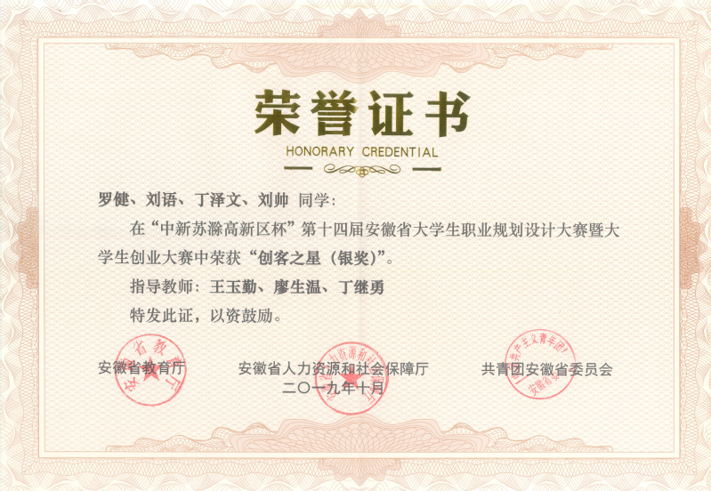第十四屆安徽省大學生職業規劃設計大賽暨大學生創業大賽——創客之星(銀獎) 2019.10