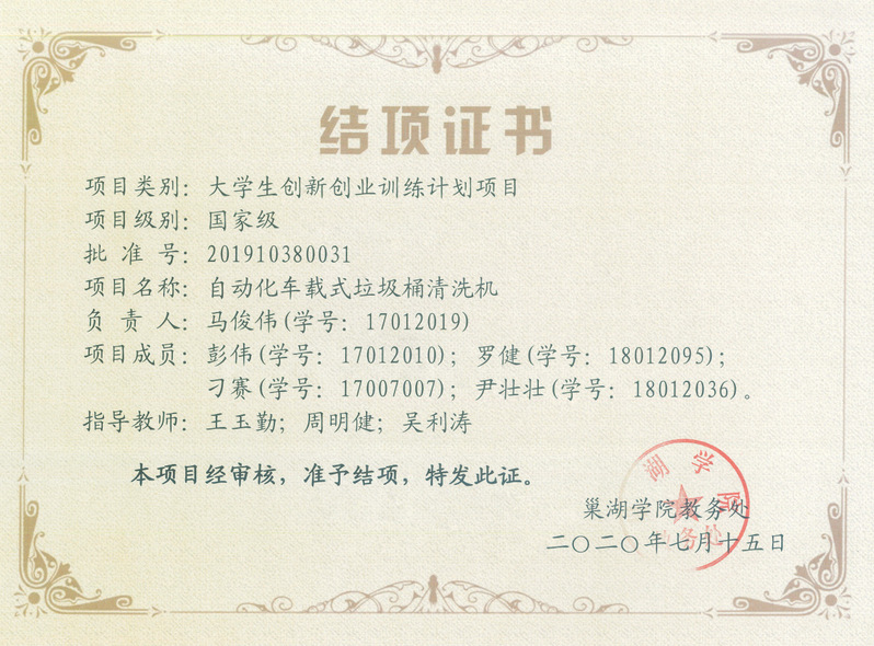 國家級大學生創新創業計劃訓練 ——自動化車載式垃圾桶清洗機 2020.07.15