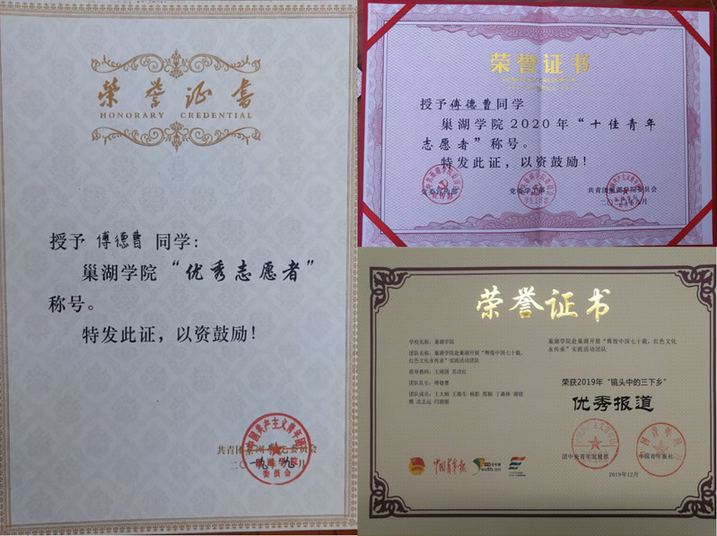 傅德曹,男,漢族,2000年出生,中共黨員,安徽省滁州市人,系巢湖學(xué)院機(jī)械工程學(xué)院2018級機(jī)械設(shè)計(jì)制造及其自動化專業(yè)1班學(xué)生。在校期間,曾任機(jī)械工程學(xué)院青年志愿者協(xié)會副會長,班級宣傳委員。曾獲得國家勵志獎學(xué)金、校級二等獎學(xué)金、校級優(yōu)秀畢業(yè)生、優(yōu)秀團(tuán)干、優(yōu)秀學(xué)干、優(yōu)秀學(xué)生、優(yōu)秀志愿者和十佳青年志愿者等榮譽(yù)稱號。2019年帶隊(duì)參加“三下鄉(xiāng)”活動,獲得優(yōu)秀通訊員榮譽(yù)稱號。2022年成功考上南昌航空大學(xué)碩士研究生。