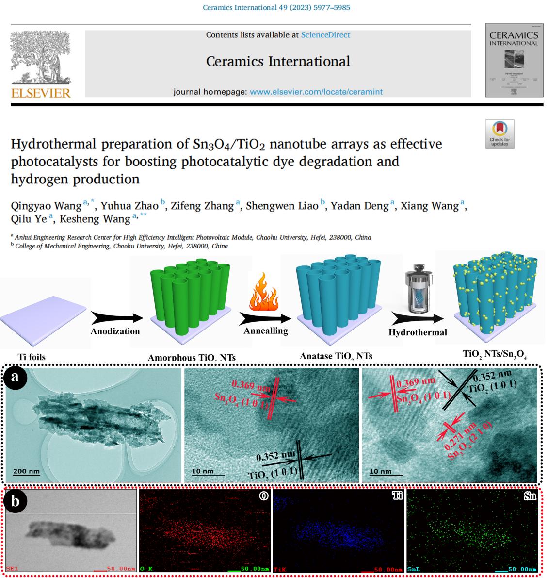 ESI高被引論文是同一年同一個ESI學科中發表的所有論文按被引用次數由高到低進行排序,排在前1%的論文。ESI高被引論文是評價高校學術水平及影響力的重要評價指標。該論文聚焦新能源開發和水污染治理,通過水熱合成Sn3O4/TiO2納米管陣列光電極材料并應用于光電轉換、光電催化產氫及工業廢水治理。水熱沉積技術制備的Sn3O4/TiO2納米管陣列光電極可以實現有機染料亞甲基藍的100%分解及91.67%重金屬離子Cr6+的清除,同時可以有效提升光電轉換和高效分解水制氫效率。最后,論文提出了光電催化自由基形成及異質結界面載流子遷移機理,為光電極的合成及應用提供了解決方案。
