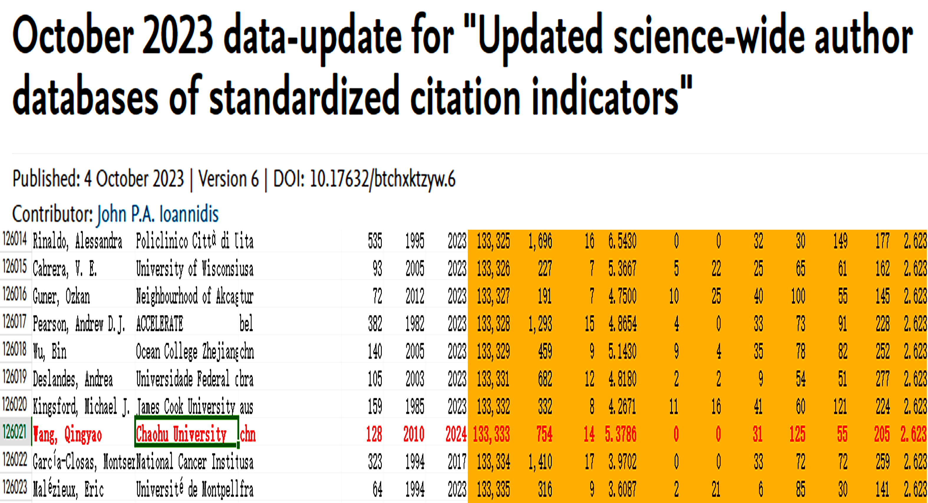 近日,美國斯坦福大學發布了2023年全球前2%頂尖科學家榜單(World's Top 2% Scientists 2023),機械工程學院王青堯博士入選“2023年度科學影響力排行榜”。美國斯坦福大學全球前2%頂尖科學家榜單是Elsevier和斯坦福大學John P. A. Ioannidis教授團隊聯合發布,為全球學術界提供一個面向科學家長期科研表現的衡量指標,旨在更客觀、更真實地反映科學家全球影響力。
