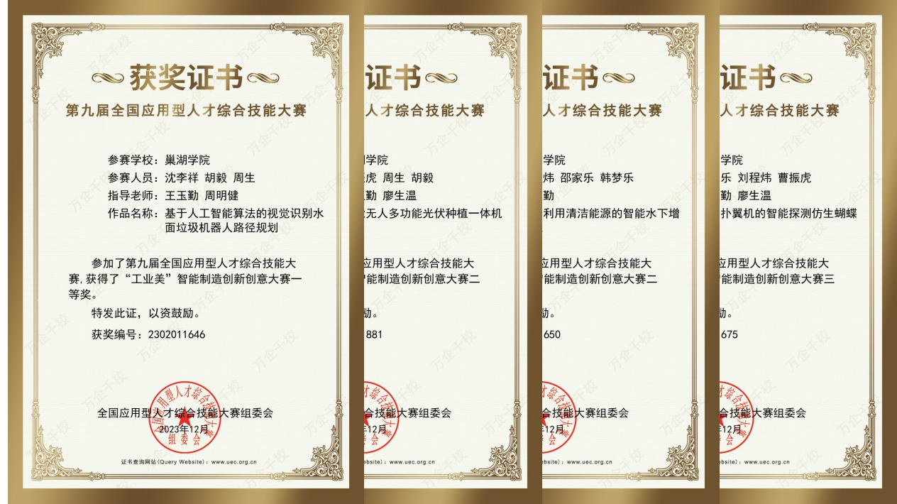 自接到大賽通知以來,機械工程學院高度重視,廣泛宣傳動員,共選拔9支隊伍參賽,并安排專業教師進行賽前指導。在“工業美”智能制造創新創意大賽科目中,機自專業沈李祥、胡毅、周生三位同學的作品“基于人工智能算法的視覺識別水面垃圾機器人路徑規劃”榮獲全國一等獎,機自專業曹振虎、周生、胡毅、劉程煒、邵家樂、韓夢樂六位同學的“智能無人多功能光伏種植一體機”等2件作品分別榮獲全國二等獎和全國三等獎。