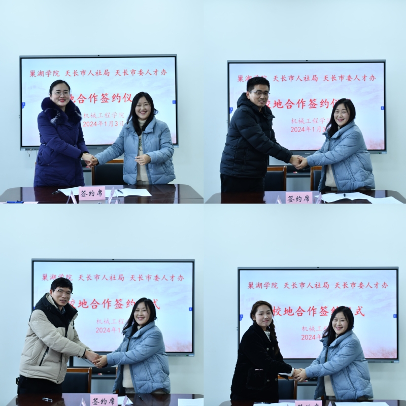 為規范實踐教學和實習就業基地建設,提升人才培養質量,在天長市人力資源和社會保障局、天長市人才辦公室共同促進下,2024年1月3日,機械工程學院和天長市天翔集團有限公司、安徽鑫鉑鋁業股份有限公司、富安電子有限公司及今麥郎飲品股份有限公司四家企業于崇學樓北205舉行實習就業基地集中簽約儀式。出席簽約儀式的有天長市人社局黨組成員、就業中心主任繆建彬,天長市委人才辦主任吳金歡,機械工程學院黨委書記張連福、院長許雪艷、黨委副書記李融、副院長張自鋒以及天長市相關企業代表。