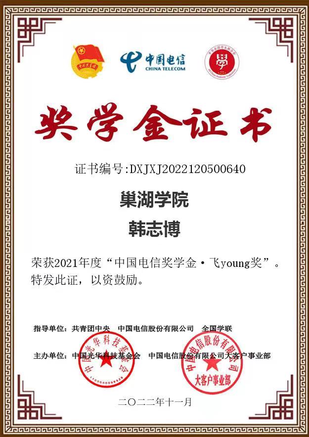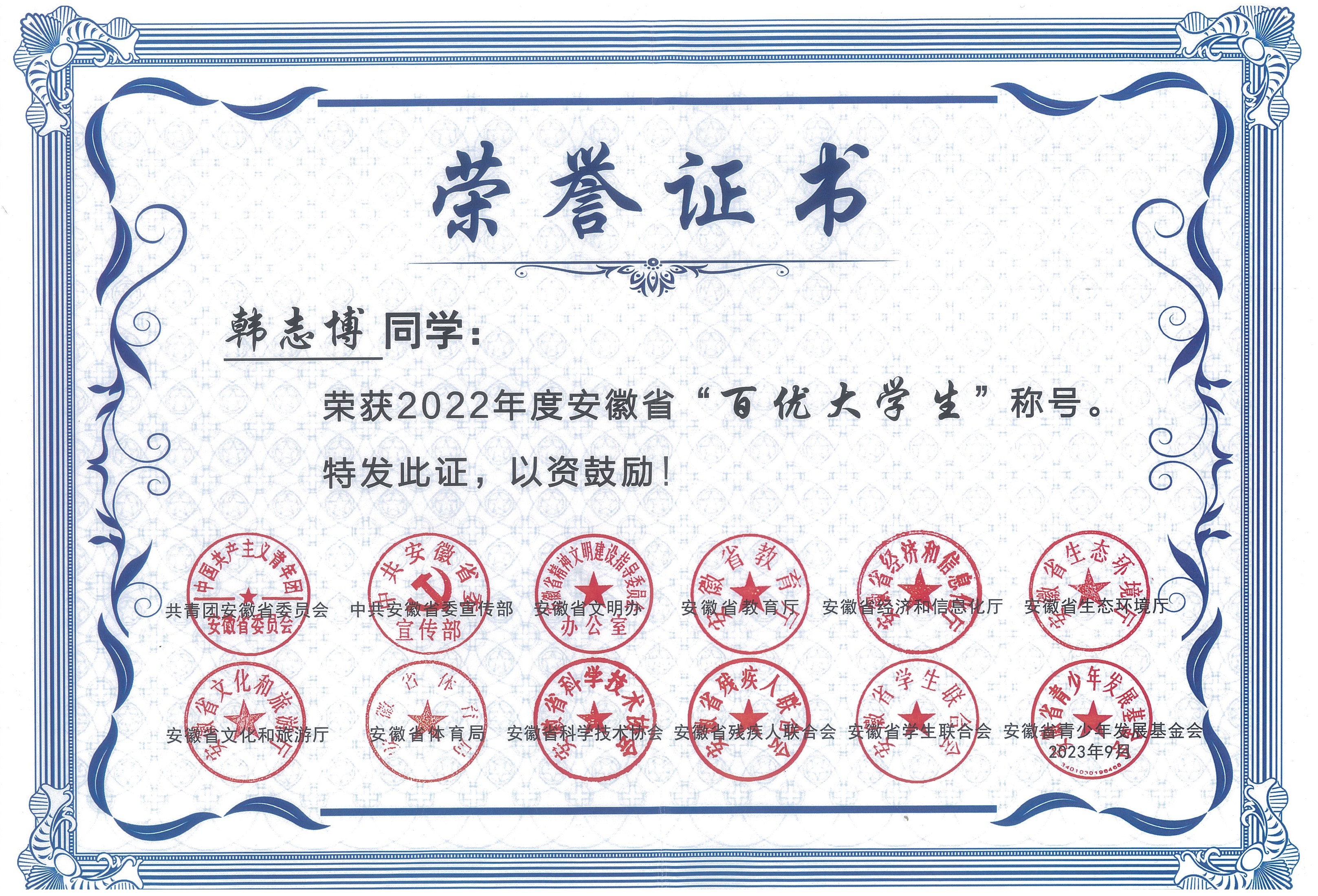 韓志博,男,2001年4月出生,漢族,中共黨員,巢湖學院機械工程學院2020級機械設計制造及其自動化學生。在校期間任班級團支部書記,曾任機械創新協會社長。任職期間,所在班級團支部曾獲學校“五四紅旗團支部”“先進團支部”等榮譽稱號。個人曾獲2022年度“安徽省大學生年度人物”“安徽省百優大學生”等榮譽稱號,2021年度本科生國家獎學金、2022年度中國電信獎學金飛Young獎、第九屆挑戰杯安徽省大學生課外學術科技作品競賽二等獎等省級及以上獎項20余項。授權發明專利2項、實用新型專利1項,發表學術論文5篇。主持國家級大學生創新創業項目2項,作為項目成員參與國家級、省級大創項目各1項。2024年5月,考取華中農業大學碩士研究生。