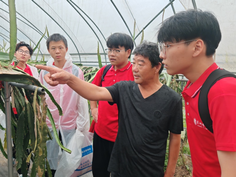 7月13日下午,鄉村振興實踐團成員來到瀛洲鎮百果園種植基地。果園負責人親自為實踐團成員介紹了果園的火龍果以及使用的新型散熱系統。