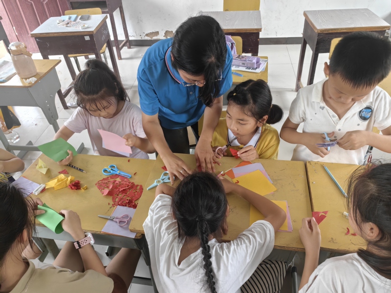 薄薄卡紙,累累碩果,團隊組織了剪紙折紙工藝學習。留守兒童們不僅收獲了親自動手的實踐成果,還豐富了他們內(nèi)心對于生命的憧憬和自我成就感。